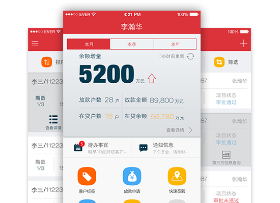 原來客戶辦理業(yè)務(wù)主要以紙質(zhì)資料為主,這樣就出現(xiàn)了內(nèi)部信息溝通不順暢,效率低下等問題。了解客戶具體情況之后,根據(jù)客戶需求我們將用戶管理、貸款申請(qǐng)審核、貸款項(xiàng)目及狀態(tài)查看、日程安排及工作日志管理等業(yè)務(wù)都搬到線上APP,徹底解決了上述問題。